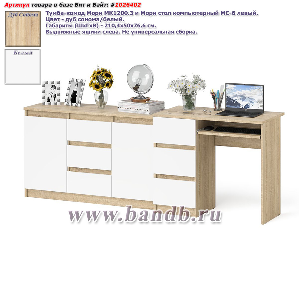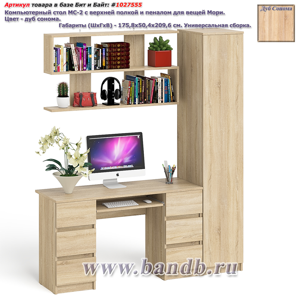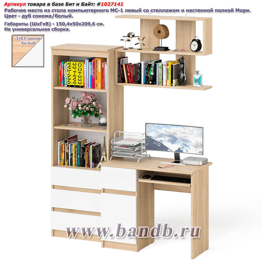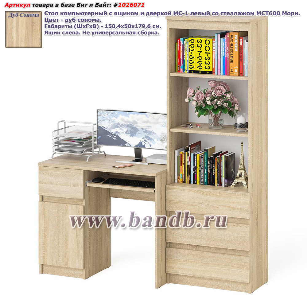 Стол компьютерный МС-1 левый с пеналом Мори 400. Цвет - дуб сонома. Габариты (ШхГхВ) 130,4х50,4х209,6 см. Ящик слева. Не универсальная сборка. Отсутствие ручек главное преимущество данной модели. Роль ручек выполняют сами фасады. Небольшой стол компьютерный МС-1 левый с тумбой и выдвижной панелью для клавиатуры. Узкий высокий пенал МШ400.1 за распашной дверкой расположены пять полок.