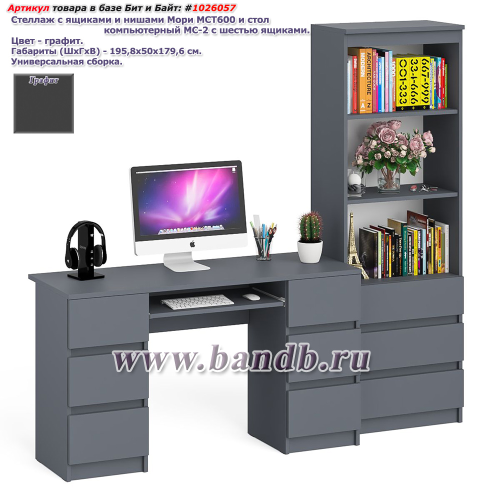 Комод три ящика МК800.1 с компьютерным столом Мори МС-1 правый и навесной полкой 900. Цвет - графит/белый. Габариты (ШхГхВ) 170,4х50х209,6 см. Не универсальная сборка. Тумба стола справа имеет нишу с полкой за дверкой и ящик на роликовых направляющих. Комод с 3 выдвижными ящиками на роликовых направляющих. 3 полки с боковыми стенками по диагонали соединеных 2 задними панелями.