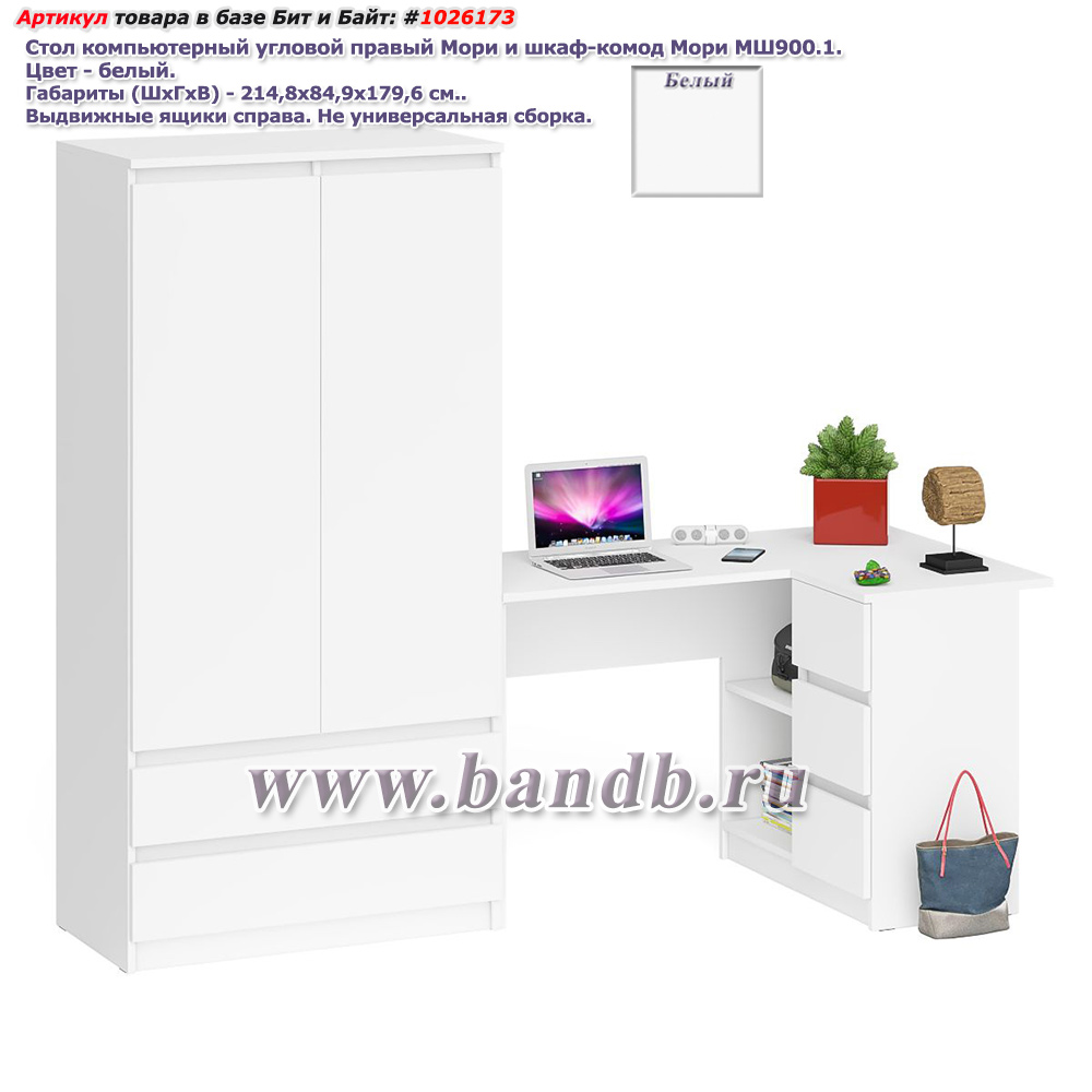 Стол компьютерный угловой правый Мори и шкаф-комод Мори МШ900.1. Цвет - белый. Габариты (ШхГхВ) 214,8х84,9х179,6 см. Выдвижные ящики справа. Не универсальная сборка. Отсутствие ручек главное преимущество данной модели. Угловой компьютерный стол МС-16 правый имеет 3 выдвижных ящика и нишу с полкой по середине. Шкаф-комод оборудован двумя распашными дверями сверху и двумя выдвижными ящиками снизу.