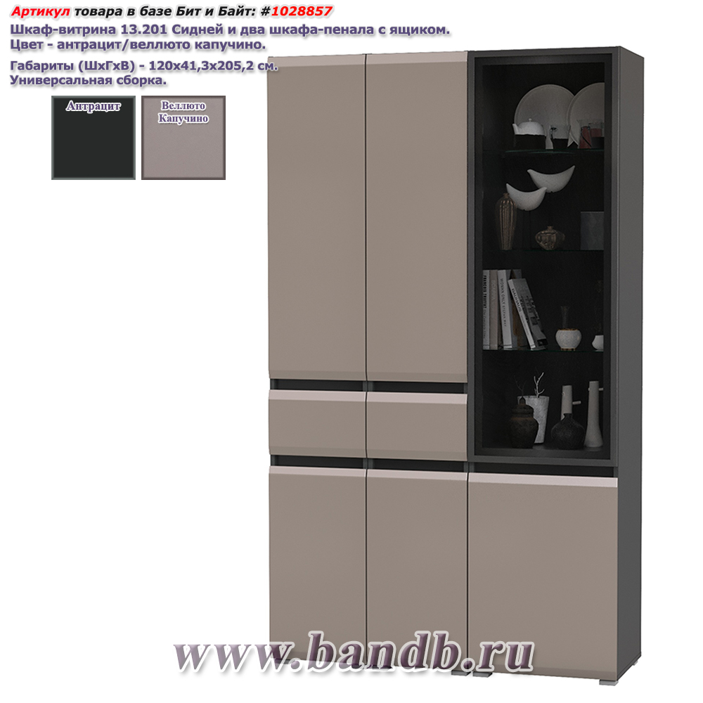 Шкаф-витрина 13.201 Сидней и два шкафа-пенала с ящиком. Цвет - антрацит/МДФ веллюто капучино/стекло. Габариты (ШхГхВ) 120х41,3х205,2 см. Универсальная сборка. Фасады могут открываться за край (ящики), либо нажатием (дверцы), с помощью механизма Push-to-Open, позволяющий отказаться от использования ручек. Универсальная сборка - сторону открывания дверей, Вы определяете при сборке.