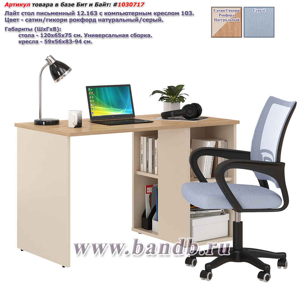 Лайт стол письменный 12.163 с компьютерным креслом 103 цвет сатин/гикори рокфорд натуральный/цвет кресла серый