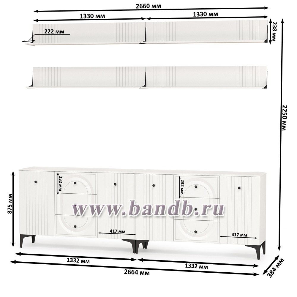Габаритры комода (ШхГхВ): 133,2х38,4х87,5 см (в компл. 2 ед.).