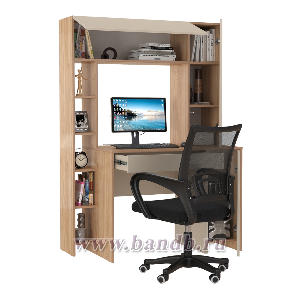 • Тумба расположена с правой стороны стола компьютерного, стеллаж - с левой. Дверки и ящик стола Комфорт 12.71 открываются за край фасада.