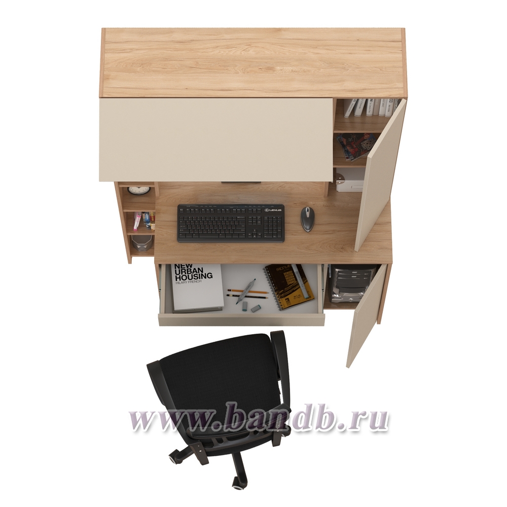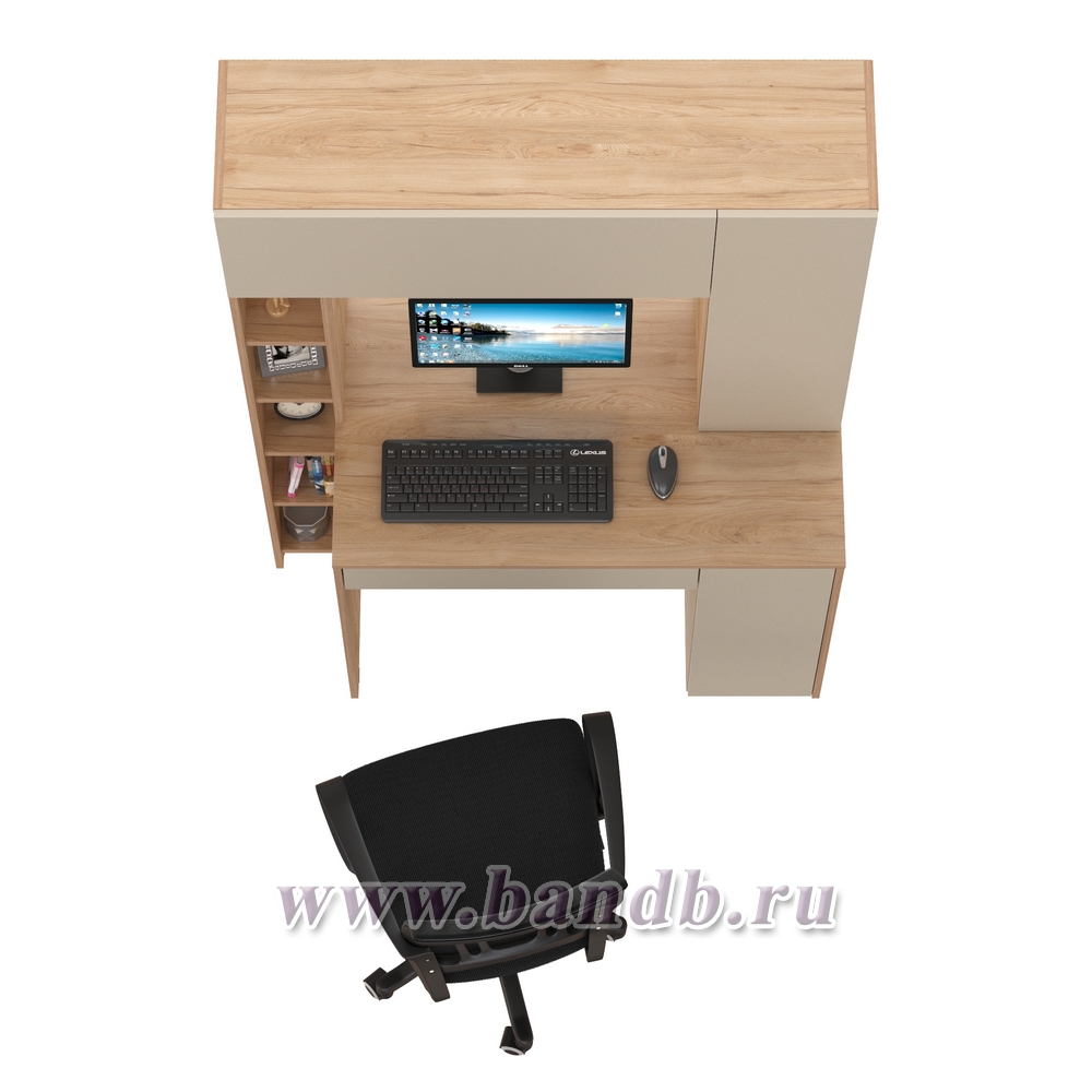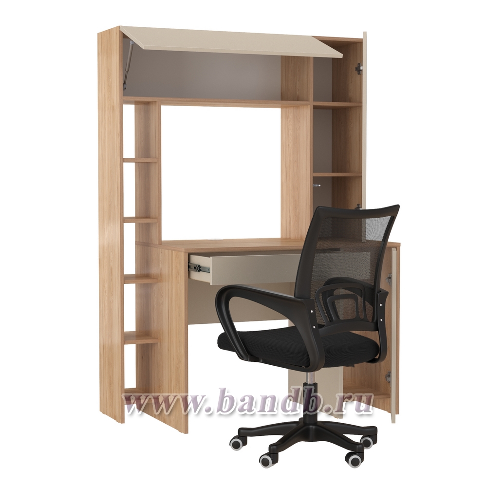 • Надстройка с вместительной нишей за откидным фасадом и распашным отделением с полкой, выделяет на столе удобную нишу для монитора.