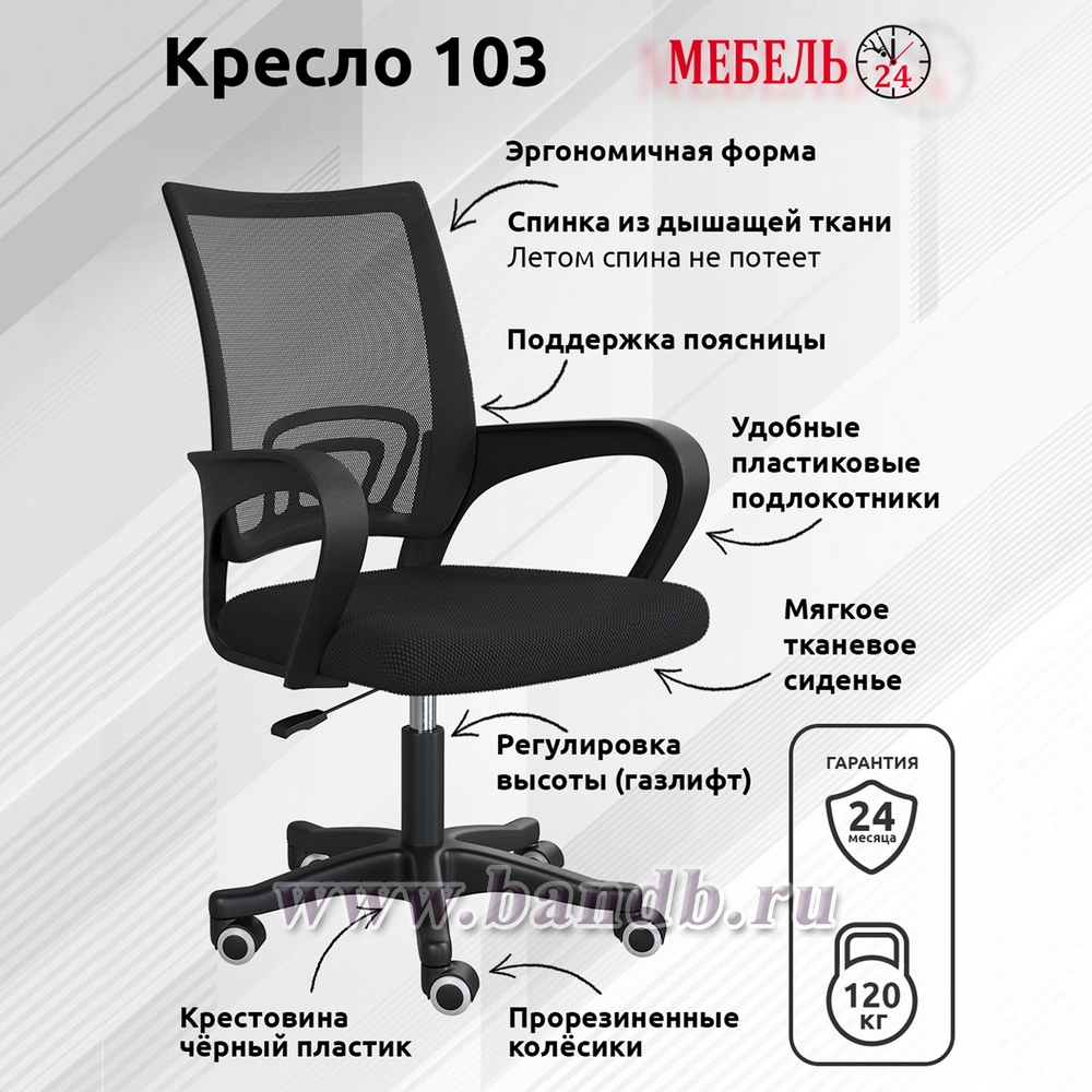 Кресло компьютерное Мебель-24 103. Цвет - чёрный. Обивка - сетка/текстиль. Габариты (ШхГхВ) 59х56х83-94 см. Ввыдерживает нагрузку до 120 кг. Тканевое сиденье с обивкой из сетки и текстиля и наполнителем из поролона. Упругая спинка из сетки. Пластиковая поддержка для поясницы. Удобные подлокотники. Стальной подъемный механизм газлифт. Материал каркаса и крестовины - пластик. Прорезиненные колёсики.