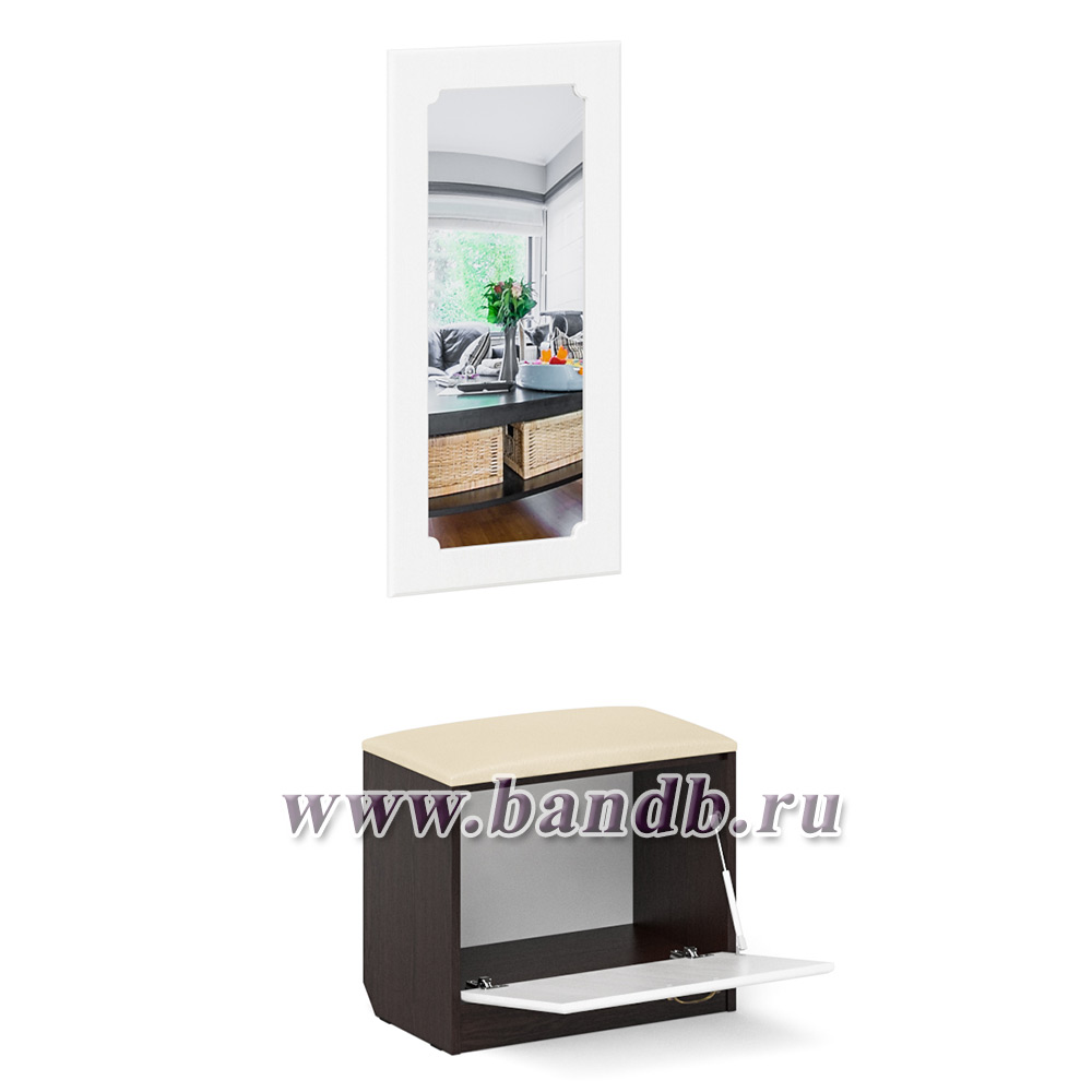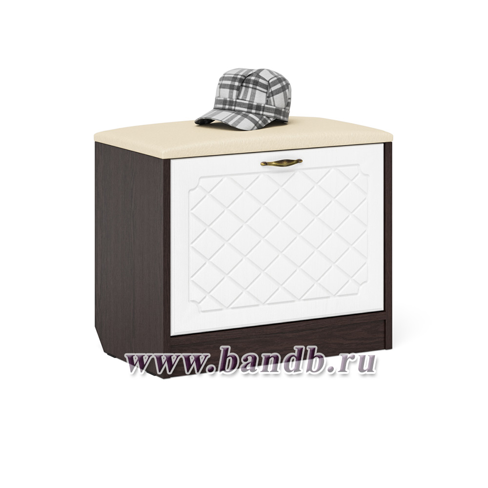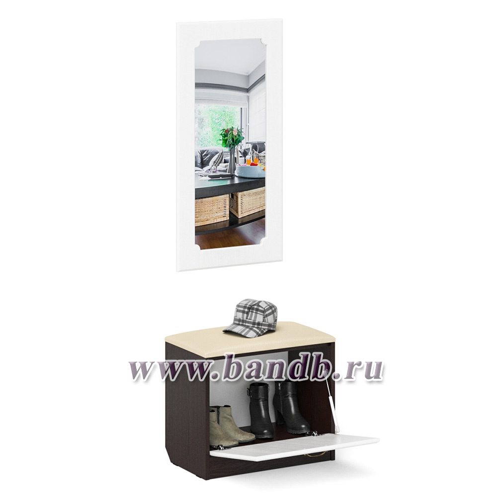 Обувница с мягким сиденьем с зеркалом П-6 цвет венге/фасады МДФ белое дерево фрезеровка ромб
