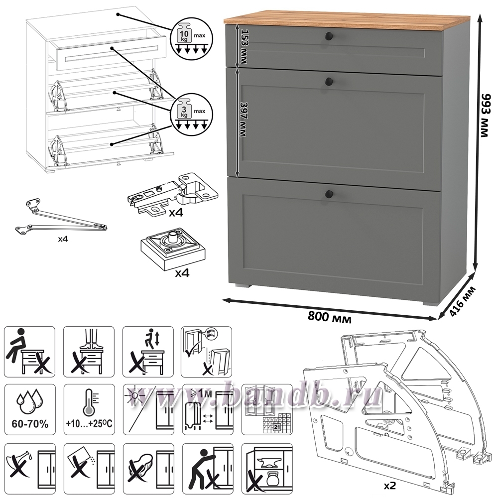 Габаритные размеры тумбы для обуви (ШхГхВ): 80х41,6х99,3 см.