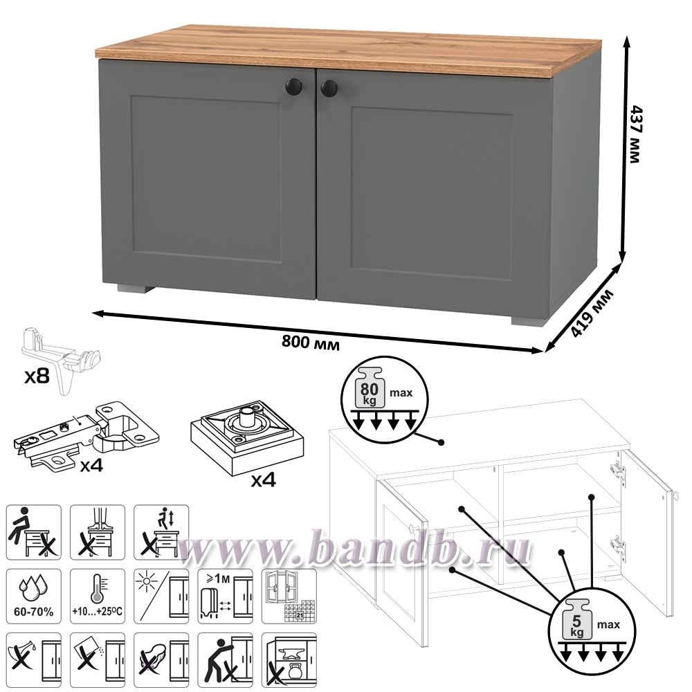 Габаритные размеры тумбы (ШхГхВ): 80х41,9х43,7 см.