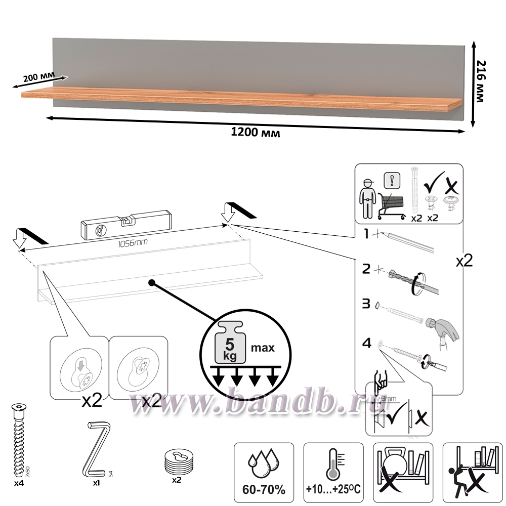 Габаритные размеры полки (ШхГхВ): 120х20х21,6 см.