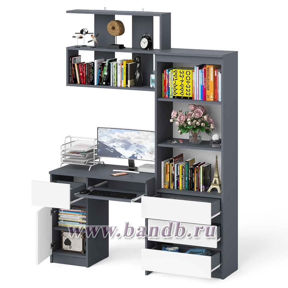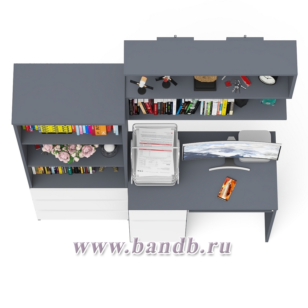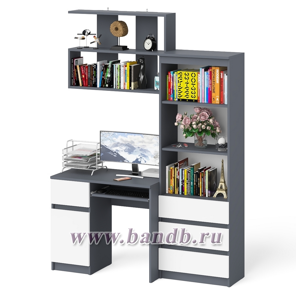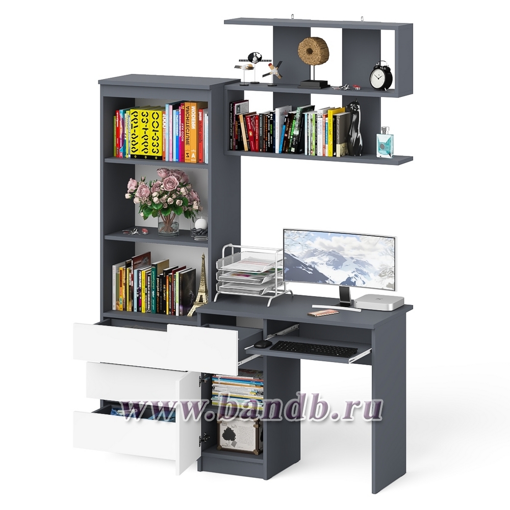 Рабочее место из стола компьютерного МС-1 левый со стеллажоми и настенной полкой Мори цвет графит/белый