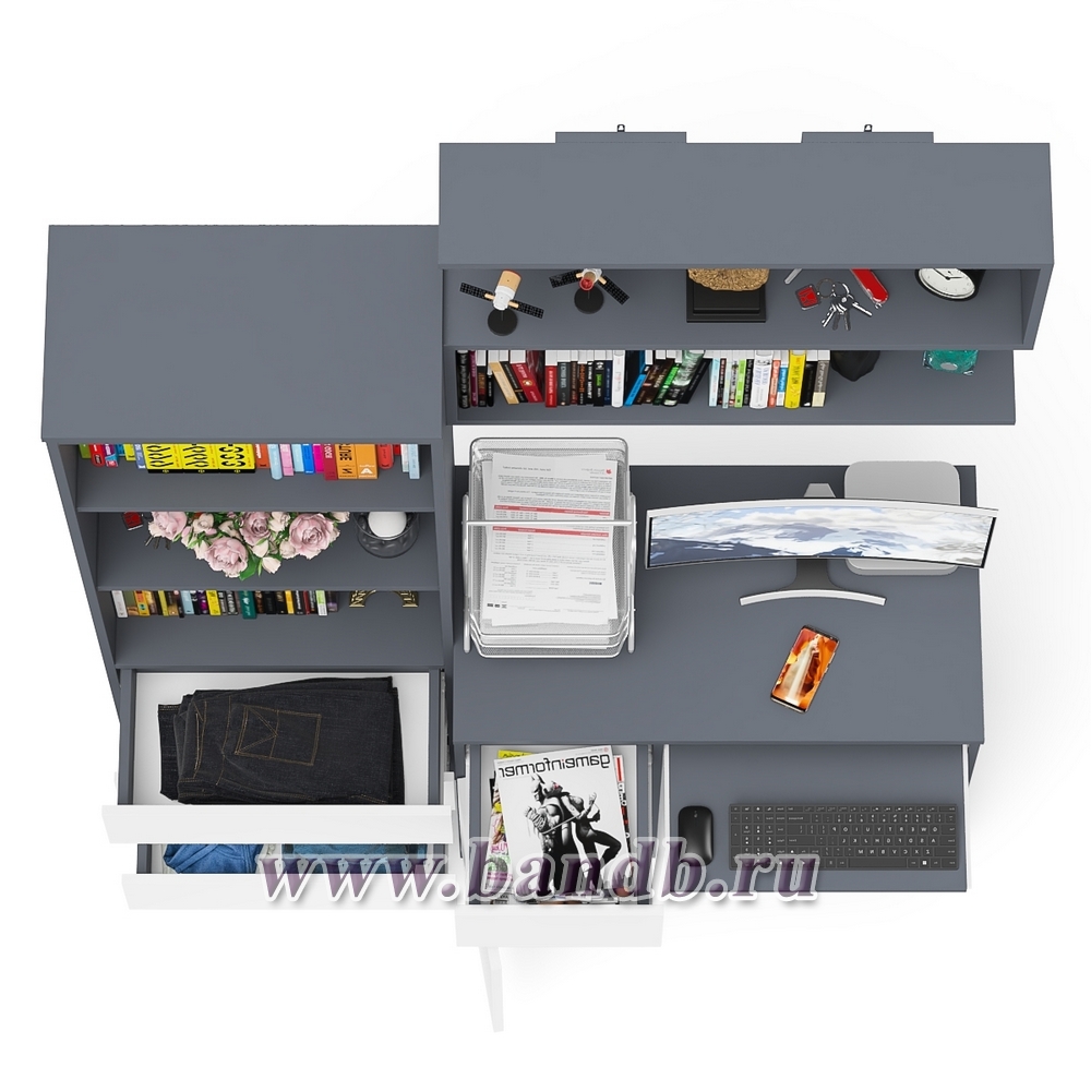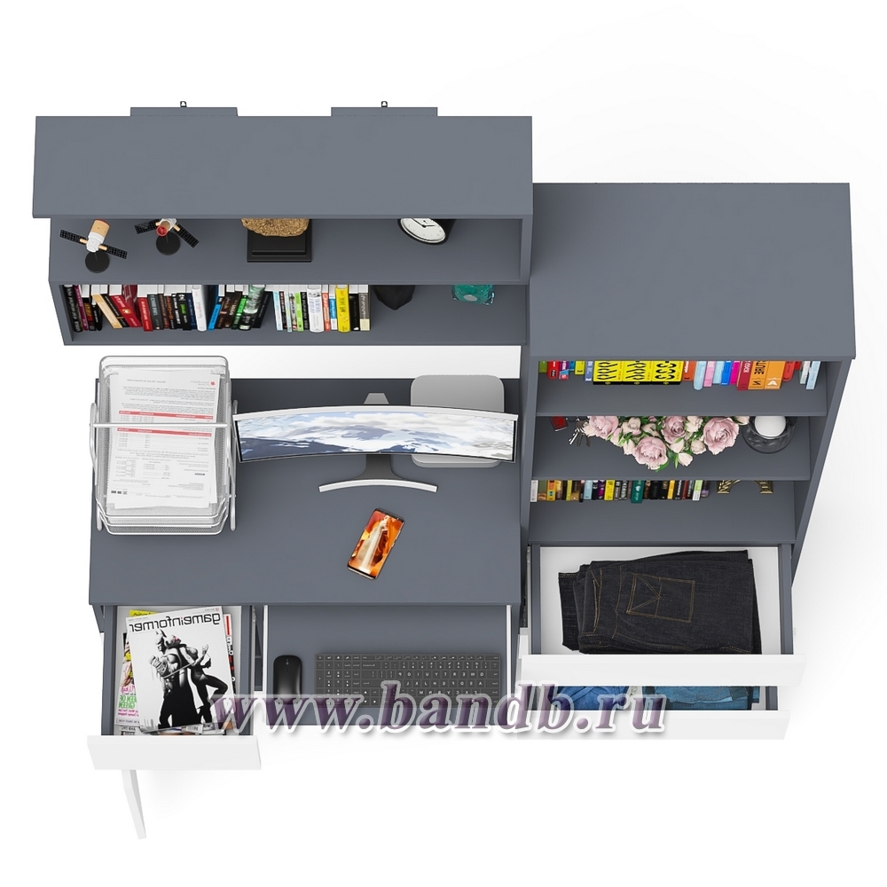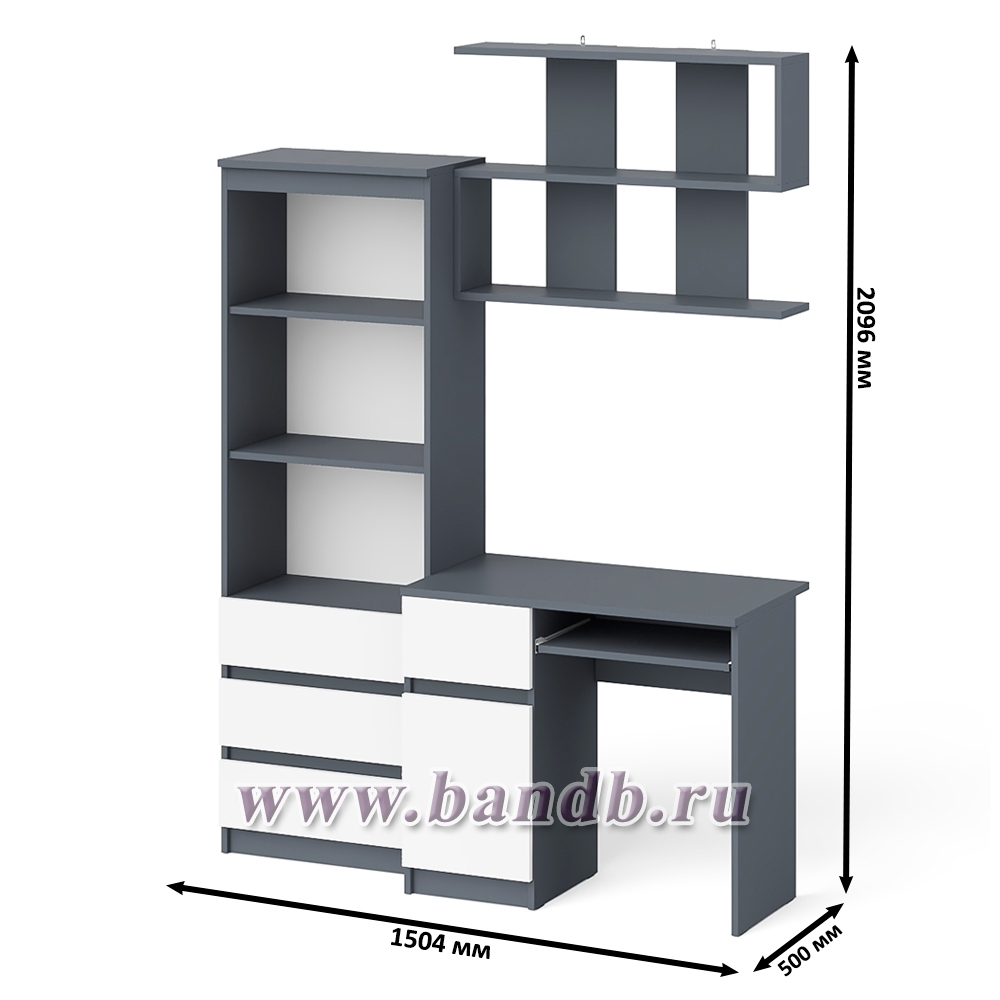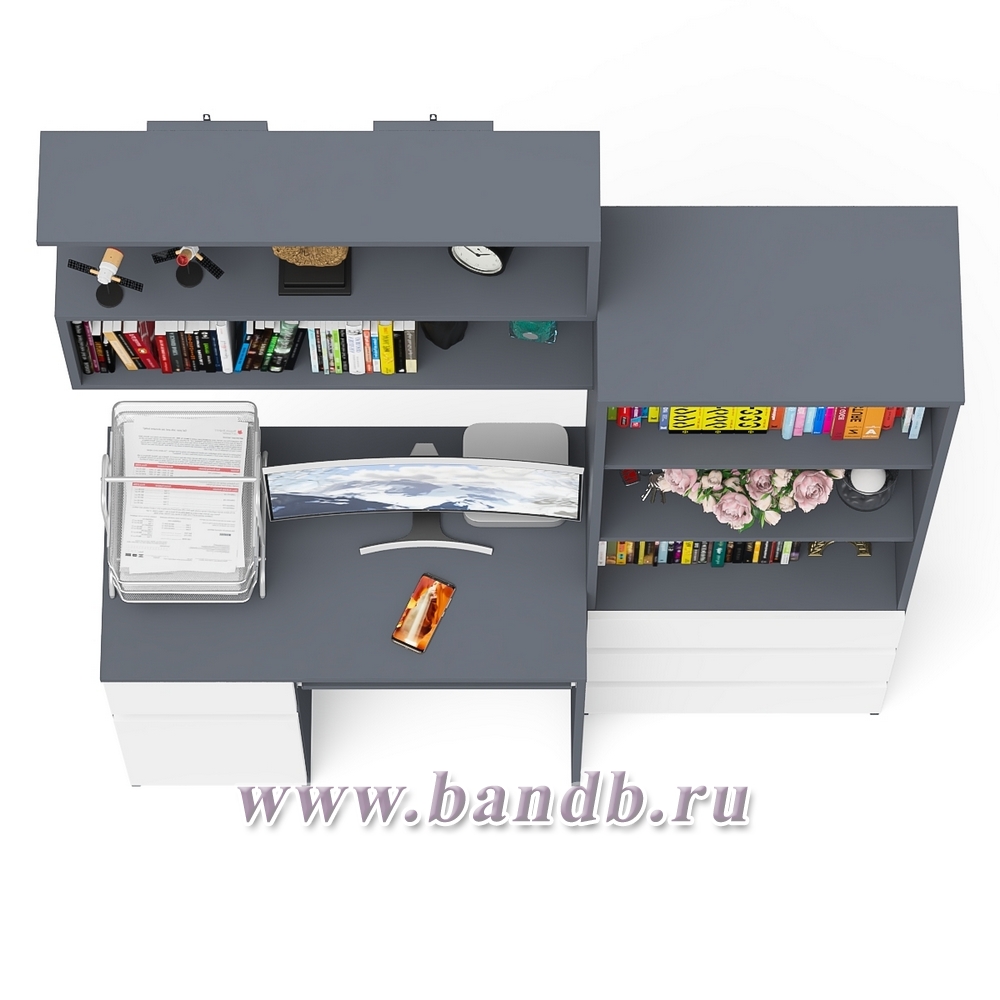 Рабочее место из стола компьютерного МС-1 левый со стеллажоми и настенной полкой Мори цвет графит/белый
