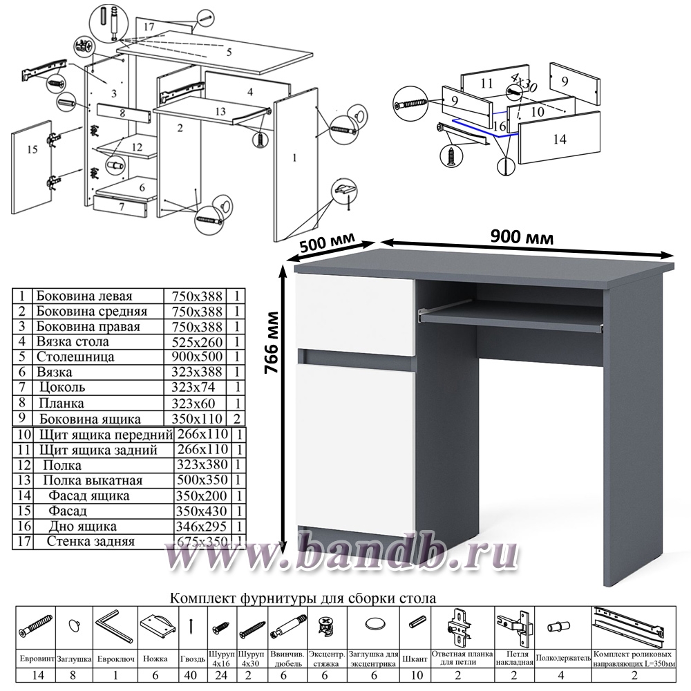 Особенности: ящик слева, выдвижная полка для клавиатуры.
