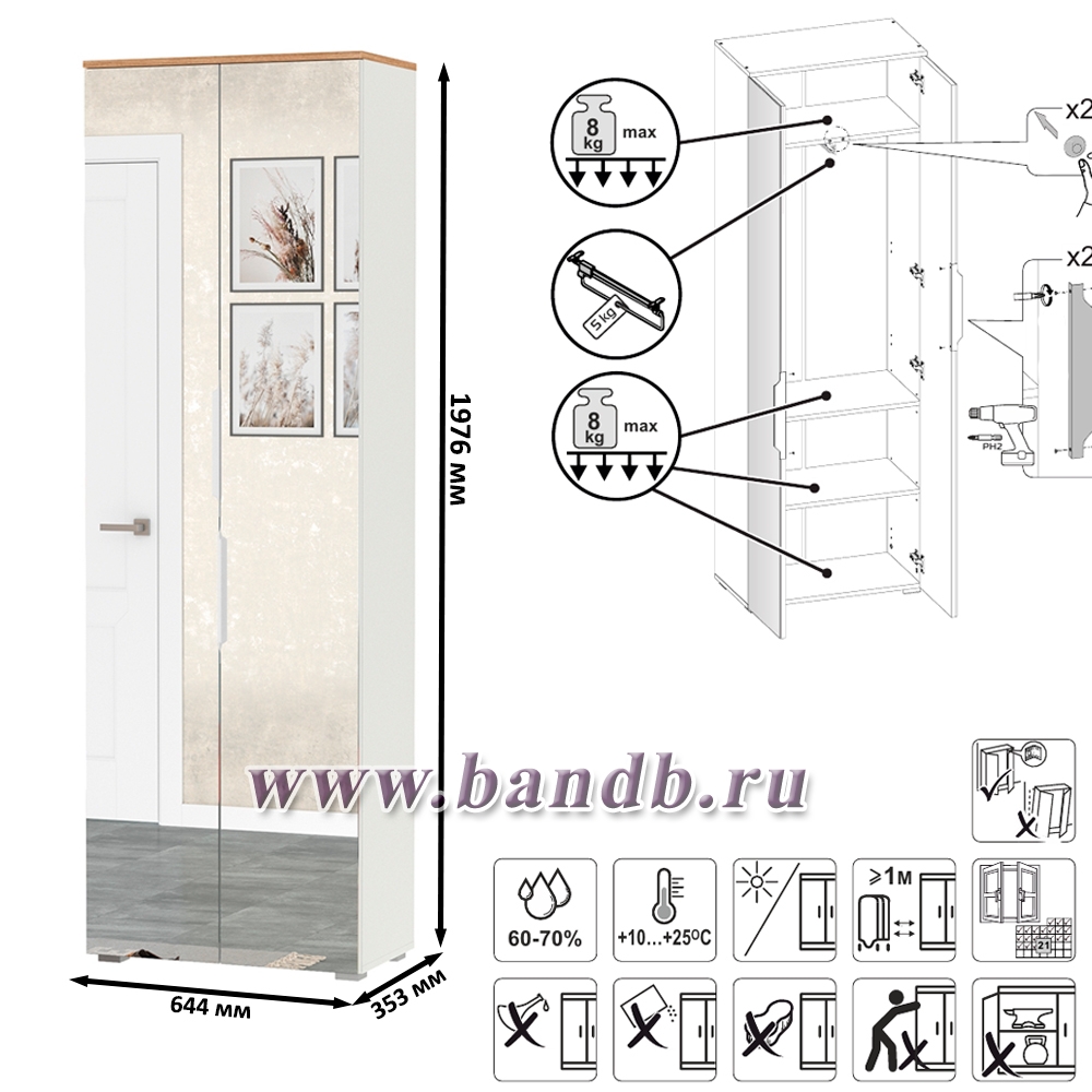 Габаритные размеры шкафа (ШхГхВ): 64,4х35,3х197,6 см.