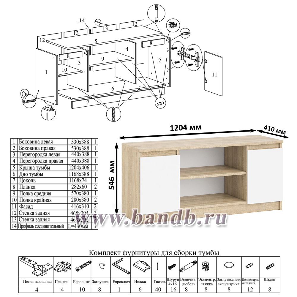 Габаритные размеры тумбы ТВ (ШхГхВ): 120,4х41х54,6 см.