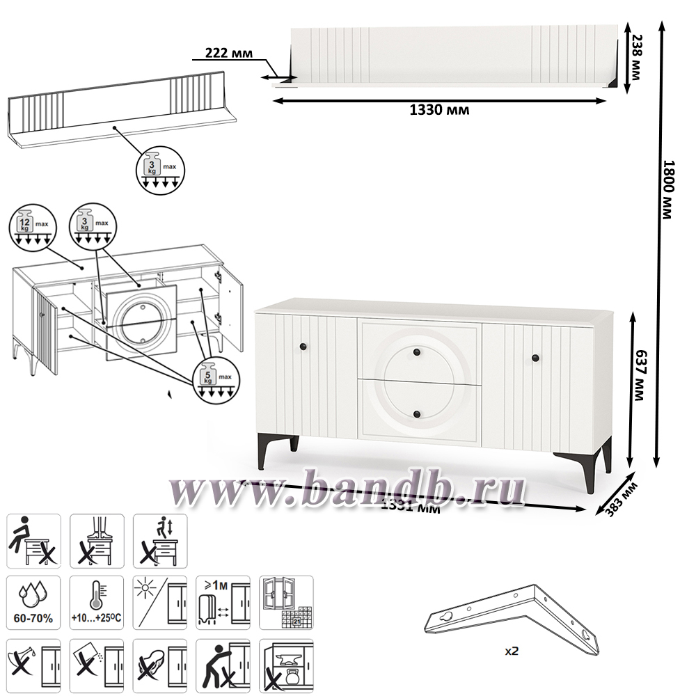 Габаритры ТВ тумбы (ШхГхВ): 133,1х38,3х63,7 см.