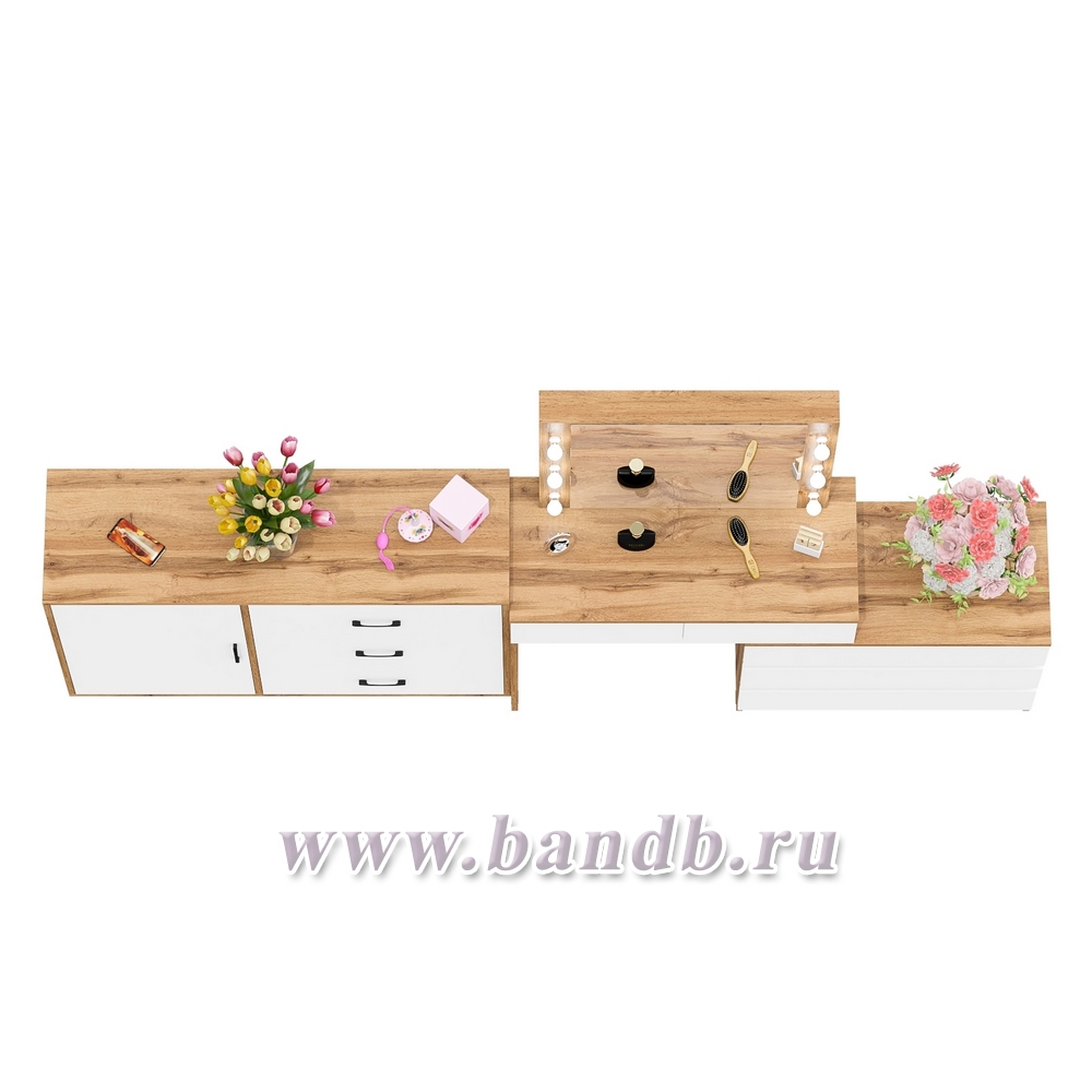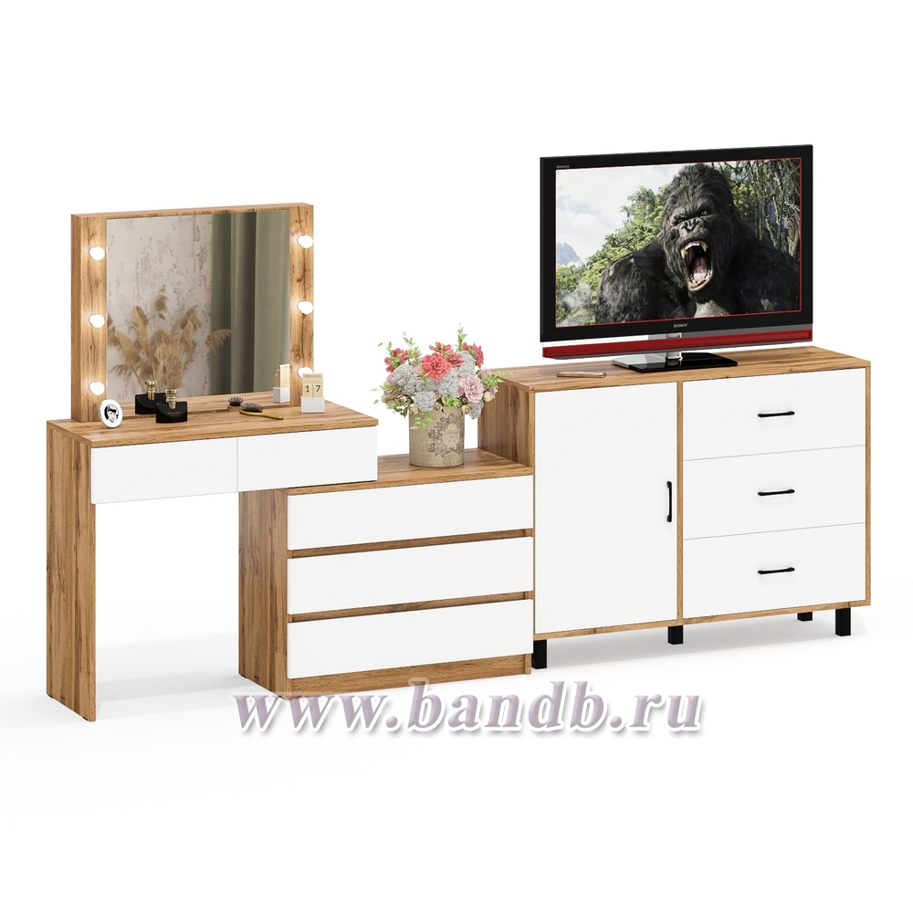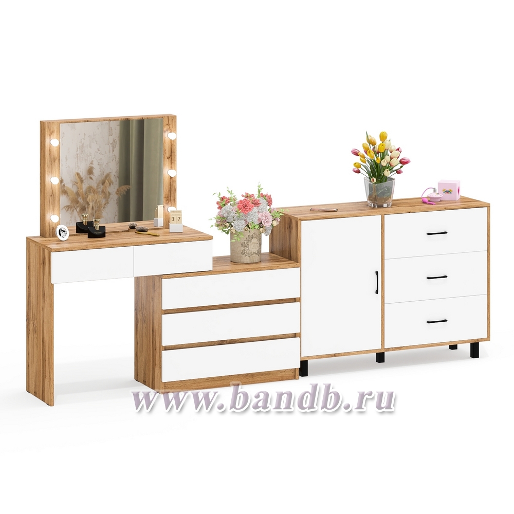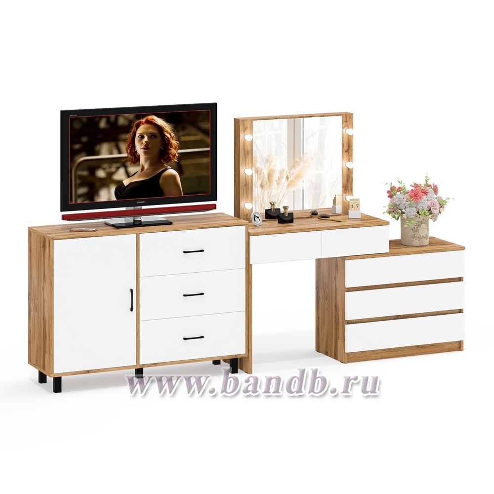 Угловой туалетный столик с подсветкой 110 и тумба-комод дверка и 3 ящика 122-1204 цвет дуб вотан/белый