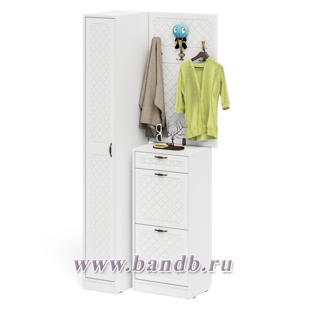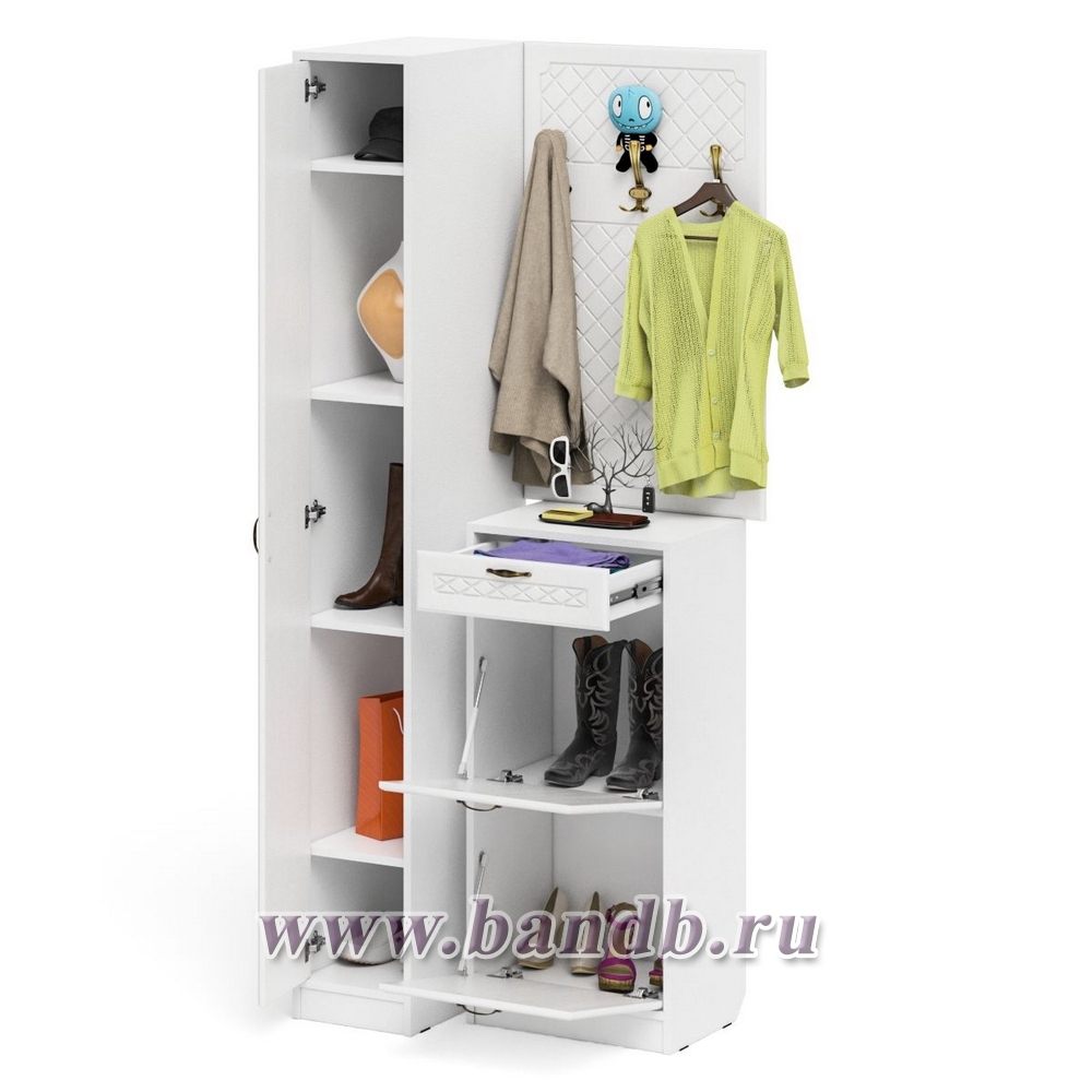 Высокая обувница с вешалкой с крючками и пеналом П-6-500 для прихожей цвет белая шагрень/фасады МДФ белое дерево фрезеровка ромб